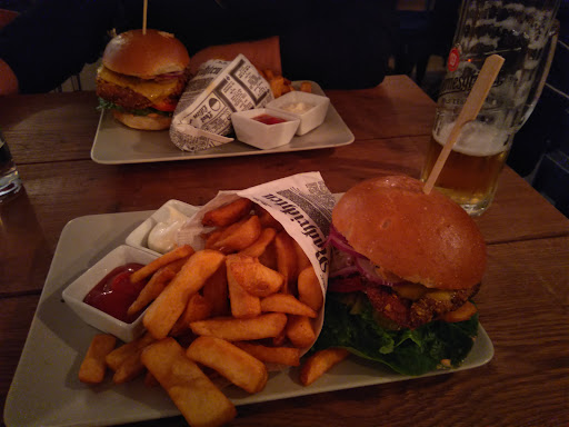 Read moreWir waren an einem Samstag Abend nach 20.00 Uhr zum Abendessen hier. Das Lokal war gut besucht, wir bekamen trotzdem noch einen Platz. Schon beim Eintreten wird man leider vom Dampf/Qualm der offenen Küche begrüßt. Wir wollten das Essen trotzdem gern probieren und nahmen an dem, von einer vollkommen gefühlslosen Kellnerin, uns zugewiesenen Tisch platz. Die Hauptkarte empfanden wir als zu klein, 5 Salate, 1 Steak, 4 Burger, 1x Nudeln, 3 oder 4 kleine Sandwiches (eher als Snack) und das unserer Meinung nach auch überteuert. Lobend erwähnen möchte ich die saisonale Karte mit Kürbissuppe und Gänsebraten. Die Getränke und das Essen wurde zeitnah serviert (Kellnerin nach wie vor absolut emotionslos). Geschmack gut, aber nix besonderes. Wir hatten Chickenburger und Pommes, pro Person knapp 12€. Die Pommes waren hausgemacht. Beim Bezahlen kaute die Kellnerin noch auf ihrem Abendessen herum und verabschiedete sich ohne ein Lächeln. Wir werden wohl nicht wiederkommen. Essen OK, für uns zu teuer, extremer Essensgeruch an der Kleidung, am freundlichsten war der Koch beim Verabschieden ... Ein kleiner Tipp: die Toiletten sollte man vielleicht deutlicher beschriften, damit man nicht aus Versehen doch in der...