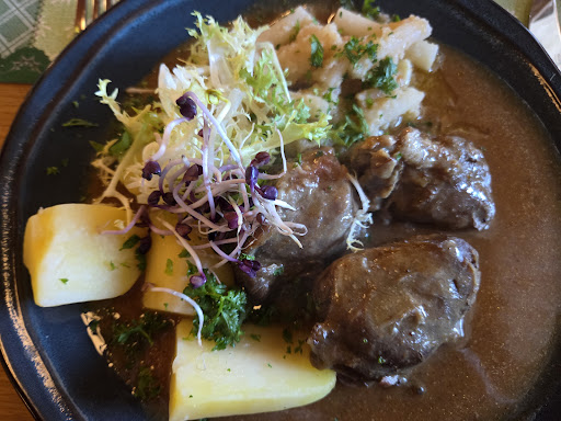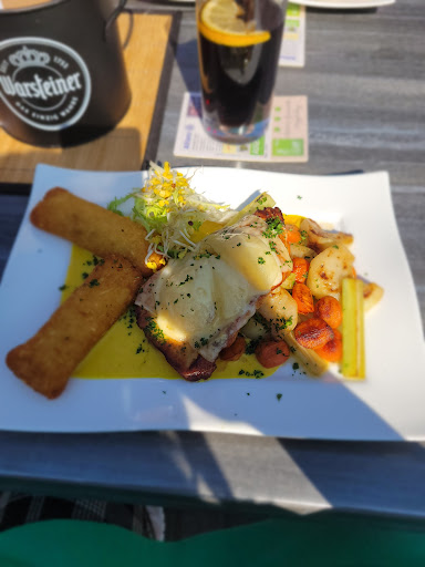 Read moreWir waren zum Mittagessen hier. Heute ist Karfreitag und die Gaststätte war gut besucht. Der Tisch war hübsch dekoriert mit Osterdeko, Körbchen mit bunten gekochten Eiern und Osterkeksen. Gekühlte Wasserflaschen standen schon auf dem Tisch. Bedienung war freundlich und Getränke wurden schnell aufgenommen und gebracht. Die Essenbestellung war leider nicht so unkompliziert, da absolut keine Beilagenänderungen möglich waren und dadurch Essenwünsche neu getroffen werden mussten. Die Speisen wurden schnell geliefert. Für ein Hähnchenbrustfilet leider zu schnell, es war noch nicht durchgegart. Problem wurde an die Servicekraft herangetragen und umgehend wurde ein komplett neuer Teller gebracht. 👍🏼 Zum Hähnchenbrustfilet mit eher „süßen“ Zutaten wie Kokos-Ananas und Sauerkirschsoße (...die durchaus etwas Herzhaftes vertragen hätte und meiner Meinung nach viel zu süß war...), passt aber auch leider der Salat überhaupt nicht. Unser Wunsch, doch bitte die Tür zu schließen, da es wirklich unangenehm an Rücken und Nacken gezogen hat, wurde nicht so wohlwollend umgesetzt. Ich hatte leider den Eindruck, das die Servierkraft zunehmend unter Druck stand und doch etwas überfordert schien. Wir mussten Sie immer wieder zu uns winken, weil wir gern noch Getränke und Dessert bestellen wollten. Von selbst kam Sie nicht, um nachzufragen. Das Eis war aber schnell auf dem Tisch und sehr lecker. Am Schluss hat sich die Serviererin allerdings für die Unannehmlichkeiten bei uns entschuldigt. Fazit: Essen ist gut und super schnell auf dem Tisch. Den Stress der Servierkraft sollte der Gast aber eigentlich nicht zu spüren bekommen, sonst fühlt er sich nicht willkommen, sondern eher als Störenfried. Einen Extrapunkt gibt es für den hübsch dekorierten Tisch. Werden sicher trotzdem mal wieder hier essen, vielleicht an einem...