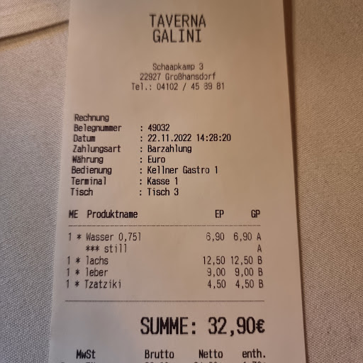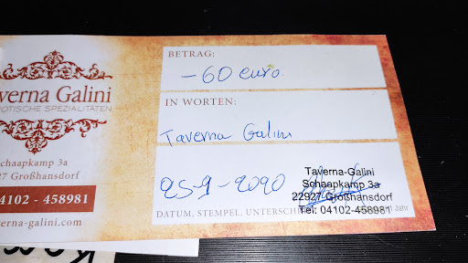 Read moreThis is our absolute favourite restaurant in the area, no other can compare! The atmosphere is warm, cosy and friendly - like in a Greek taverna. Sitting outside in the summer is wonderful, too! The food is awesome - a huge variety: for meat lovers and for vegetarians, too! Seafood is delicious as well. All the staff is extremely friendly and competent. Service is always speedy! The drinks are delicious, ouzo on the house. And a great dry red Greek wine (Merlot, in the small curvy bottle: ask for it!). Desserts are delicious, too, if you have room! 😁 The portions are big and the prices extremely reasonable. Please don’t change a thing, Thomas and Maria! We love coming to Taverna Gallini, the best restaurant in Großhansdorf...