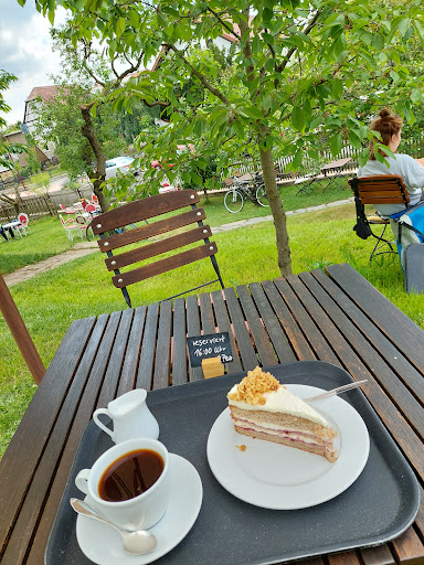 Read moreDas Café habe ich inzwischen 4 oder 5x besucht - zu verschiedenen Jahreszeiten. Ein gemütlicher Garten lädt Freiluftfans ein, die verschiedensten Sitzgruppen zu nutzen, bestehend aus schönen alten Möbeln. Auch der Innenraum passt perfekt zu diesem Stil: Holzbank mit Sitzpolstern, bequeme alte Stühle, eine Chaiselongue aus Holz und Samt usw. Eine Sammlung aus tollen historischen Möbeln aus Uromas Zeiten und einem weißen Tresen inkl. Glasvitrine und dazu einem supermodernem Kaffeeautomat mit überaus leckerem Kaffee aller Art und Traumtorten😉 nebenan. Man fühlt sich in die Kindheit zurück versetzt. Ich liebe es einfach hierher zu kommen und eine kurze Zeit hier zu genießen. Gern auch mit einer lieben Freundin, die dann genauso happy aussieht...