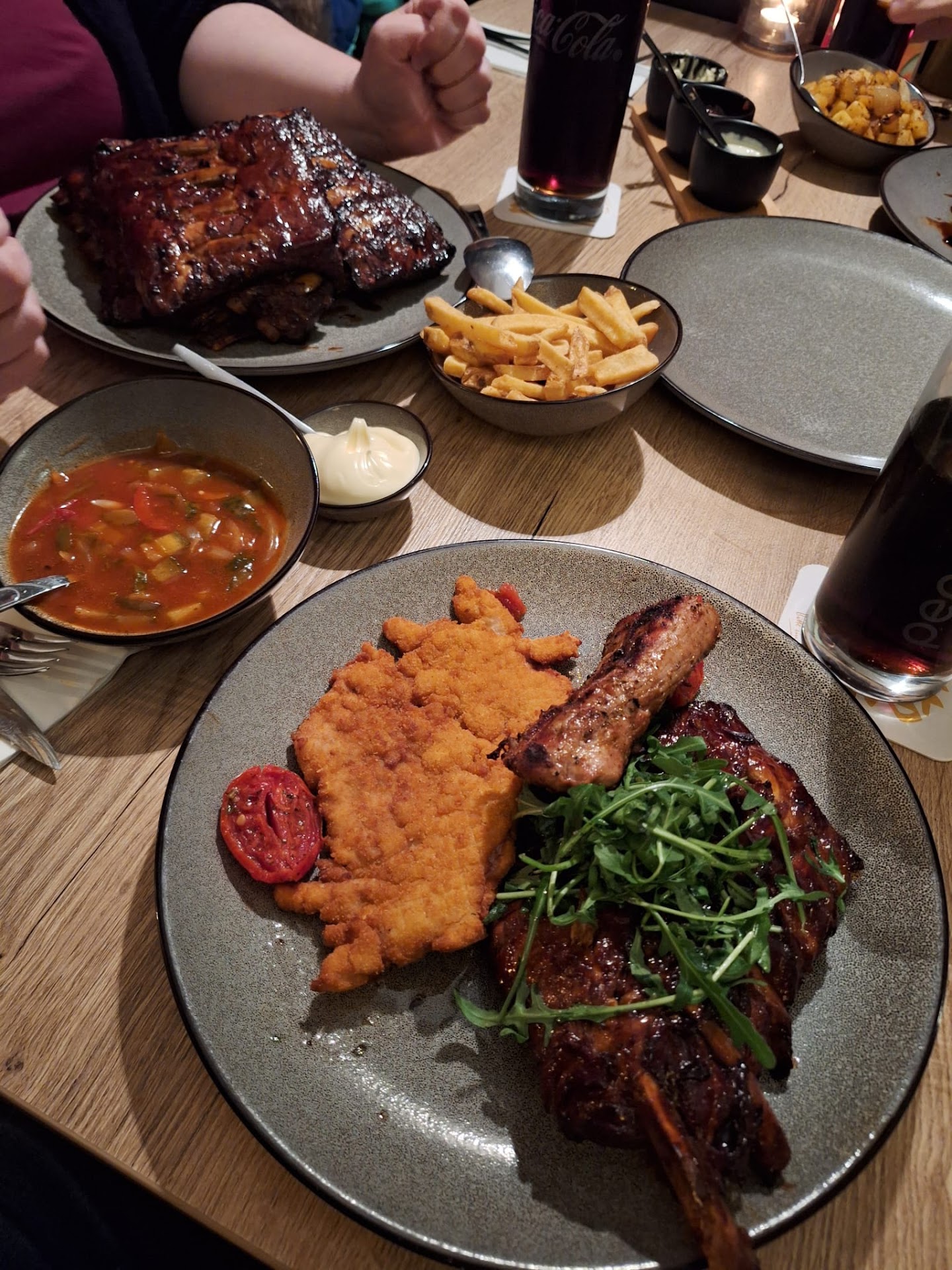 Wir sind ein bisschen enttäuscht vom heutigen Abend, hatten wir doch so hohe Erwartungen! Der Tisch war reserviert, und als wir kamen mussten wir ersteinmal warten, da erst nachgefragt werden musste, wo man uns hinsetzt. Der Platz war semi gut, denn wir bekamen stets Zug ab, wenn die Türen geöffnet wurden. Für reservierte Plätze hätte ich mir etwas besseres gewünscht. Das Lokal ist schön, hat aber durch die Bauweise ein Akustikproblem. Wenn es voll ist, ist es laut. Da kann man nicht viel machen. Nunja, auf den Plätzen haben wir dann auch erstmal eine Weile gewartet, bis man uns wieder beachtet hat. Ich habe mitbekommen wie der Bedienung Handzeichen gegeben wurde, weil wir noch nicht bedient wurden. Auf die Getränke haben wir ebenfalls lange gewartet. So lange habe ich auch auf einem Samstag noch nirgendwo gewartet. Bestellt wurden 3 Hauptgerichte. Brotkorb samt Soßen kamen schnell. Essen dauerte wieder. Es wurden dann 2 Schüsselchen mit Beilage gereicht: 1x Bratkartoffeln, 1x Pommes. Mehr kam für 3 Leute nicht. Ich war dann so unverschämt und habe eine Bedienung rangewunken und gefragt, ob die zweiten Bratkartoffeln auch noch kämen : in der Schale sind 2 Portionen, wenn wir noch was bräuchten, können wir ja nachbestellen. Auf mein entschuldigendes: das war so nicht ersichtlich kam ein barsches: doch! Ja sorry das ich gefragt habe, ganz ehrlich! Und nochmal ehrlich: wenn ich schon ewig auf alles warte, wann soll ich denn dann nachbestellen, damit es noch gebracht wird, bevor ich fertig bin? Aber hey, kein Problem. Wir hatten dann auch schon keine Lust mehr nach dem Salat zu fragen- dem Salat der ja im Essen inbegriffen ist. Die Spareribes waren lecker, aber wir hatten uns verschätzt- kein Problem, kann man ja einpacken lassen. Ich weiß nicht, aber ich hatte auch da wieder das Gefühl, dass ich die Bedienung nicht hätte fragen sollen. Sie hat dann patzig gemeint, dass sie jemanden schickt. Die Dame war dann auch sehr nett- komplette Gegenteil der anderen Bedienung. Bezahlt wurde vorne. Und dann kam nochmal eine Überraschung: Die Mayo zu den Pommes wurde nicht bestellt, selbstverständlich dazugestellt und mit 1 € berechnet - hätte ichs gewusst, ich hätte sie nicht benutzt. Für den Fleischteller " beste vom Schwein" wurden Soßen empfohlen- wohlweislich das das Fleisch wohl sonst zu trocken ist. Was wir nicht wussten: die Zigeunersoße kostete 3€ extra. Absolut kein Verhältnis! Ich packe Fotos hinzu, da kann man sich dann auch von den Beilagenschälchen einen Eindruck machen. Wir werden auf jeden Fall so schnell nicht wiederkommen, da gibt es einfach auch besseres in Gronau...
