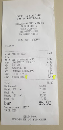 Read moreWir hatten für den 19.08.20 um 18:30 reserviert. Das klappte sehr gut , der Tisch war auch i.O. Die "corona"-Speisekarte wich bei den Preisen zur "normalen" Karte leicht nach oben ab, ab das ist völlig Okay. Was ich nicht verstehe, dass sie sehr minimalistisch war und so etwas typisches, wie Folienkartoffel mit Zaziki einfach fehlte. Das ließ sich auch nicht nachordern. Wir fanden trotzdem 4 Gerichte: Gyros mit Zaziki, Suviaki, Gyros mit Metaxasoße und Lammhaxe mit Kritharaki. Als Beilage gab es einen gemischten Salat, der schon so schlapp war, dass man meinen musste, der war vom Vortag übrig. Das Dressing dazu war eine Zumutung. Der ausgewählte Roséwein war sehr gut und das Wasser gut gekühlt, allerdings wäre ein Kühler für die Wasserflasche bei den Temperaturen gut gewesen. Die Gerichte waren enttäuschend bis auf die Lammhaxe, die war wirklich lecker. Die Suviaki waren ungewürzt, und zäh wie Schuhsole. Zusätzliche Metaxasoße, die Hoffnung weckte, hatte wenig mi diesem edlen Getränk zutun und war nur süß und mehlig, aber kostenintensiv. Das Gyros mit Zaziki sah appetitlich aus, war aber sehr trocken und am Zaziki fehlte die frische Gurke und der Knoblauch. Das beste am Gyros mit Metaxasoße war der überbackene Käse. Das Servicepersonal war sehr bemüht, aber offensichtlich überfordert. Unsere gut gemeinten Hinweise nahmen sie mit zum Koch, der unsere Kritik nur müde belächelte, was wir im Vorbeigehen zu den Örtlichkeiten auch noch mitbekamen. Fazit: Die einzige Restauration in Großpösna sitzt auf hohem Ross und muss aufpassen, nicht zu tief zu fallen. Wir werden jedenfalls dieses Lokal künftig meiden und unser Glück in den benachbarten...