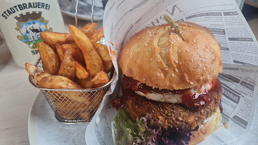 Wir haben uns von den Rezessionen eingeladen gefühlt und hofften auf sehr gute Burger. Leider kann ich jetzt die Rezessionen überhaupt nicht nachvollziehen. Wir haben uns Süßkartoffel Pommes, zwei gebrühte Eistee und zwei Zwiebelturm Burger mit extra Käse bestellt. Als wir nach ca 45-55min Wartezeit (im Restaurant waren nur 2 weitere Gäste) endlich unser Essen erhielten, wurden wir leider enttäuscht. Der Burger wird in einer Papiertüte serviert, die nach einer Minute durchweicht und am Burger klebt. Die Buns waren zwar selbstgemacht, Geschmacklich haben sie aber nach gar nichts geschmeckt. Der Käse auf dem Burger war so hauch dünn das man ihn suchen musste. Die süßkartoffel Pommes waren nicht Knusprig. Die Menge war höchstens eine Hand voll, ca 15 Pommes für unglaubliche 3,50€ den Dip bezahlt man mit unglaublichen 1,50€ extra, der in einem kleinen Papphütchen serviert wird, die ebenso durchweicht. Der gebrühte Eistee war nicht mein Geschmack. Ist halt kalter Tee mit Eiswürfel. Nichts besonderes wie ich es in anderen Restaurants kenne.