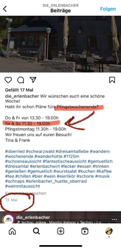 Zuhause angekommen, habe ich mir die Mühe gemacht, die Interneteinträge zu überprüfen und habe festgestellt, dass die angegebenen Öffnungszeiten auf Instagram von Post zu Post und von Tag zu Tag variieren, bzw. nicht aktualisiert wurden. Also Achtung, wer hier vorbei kommt und sich vielleicht vorher "informiert": Machen Sie sich auf "flexible" und janusköpfige Wirtsleute gefasst. Wanderer sind gut beraten, ihre Brotzeit und Getränke dabei zu haben. Wirte dieser unerfreulichen Art mit unverlässlichen Öffnungszeiten braucht kein Mensch, der hier zum Wandern oder Sporteln unterwegs ist. Im Notfall ist es nur ein sehr kurzer Weg zur nächsten Hütte.
