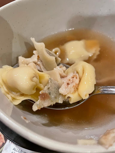 Unsere besondere Empfehlung: die Pizza Quattro Formaggi und die Leberknödel Suppe (siehe Foto). Bei der Pizza gelang es dem Koch vier Käsesorten so zu kombinieren, dass man das Gefühl hat, eine Pizza Margherita vor sich zu haben. Bei der Leberknödelsuppe darf man das Wort Leberknödel nicht zu wörtlich nehmen. Es ist eher als eine symbolische Metapher für Einlagen in einer Suppe gedacht.