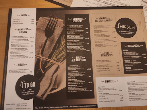 Update: 1 Jahr später besuchte ich den Gasthof Hirsch. Essen immer noch so gut wie vor einem Jahr. Bedienung sehr freundlich und aufmerksam. Mann kann inzwischen auch Online reservieren! Immer noch volle 5 Sterne! Einen kleinen Wermutstropfen gibt es dennoch. Bei den Tagesspezialessen zB.Freitag Kässpatzen, Samstags Haxen usw. steht nirgends ein Preis. Weder Online noch auf der Karte.