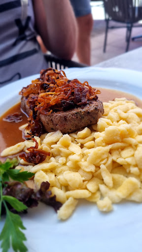 We come on holiday to Algau at least once every year and this restaurant is number one on our list no matter if it is winter or summer. The interior is quite superb with wonderful wood carvings ... Even on the ceiling ! Outdoors there are many places to sit and take in the sunshine whilst sipping a cool local Allgauer beer. The food is what brings us back time and time again. Amazing steaks and outstanding local dishes that are so tasty and made fresh every day. My sweet tooth has plenty of choice including large portions of traditional Apple Strudel. Black forest gateau being my favorite always takes preference! The staff who are very friendly and so helpful are in traditional dress which makes the whole Algau dining experience...