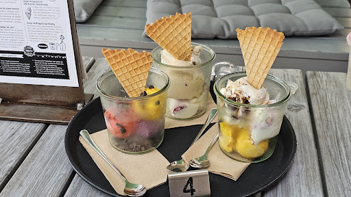 Read moreSehr leckeres selbstgemachtes Eis. Die Sorten variieren öfters mal. Die Waffeln sind auch sehr toll sowie optisch als auch geschmacklich, ist sehr auffällig da alle meistens nur Standartwaffeln haben. Die Eiskugeln kann man hier auch schön mit Saucen und Toppings nach Wahl zubereiten lassen. Haben für 5 Kugeln Eis 10€ bezahlt, sprich 2€ die Kugel, ist schon recht viel aber man muss auch sagen das hier außergewöhnliche Geschmackssorten auch angeboten werden und die Kugeln ziemlich groß sind. Sehr nettes freundliches Personal. Ambiente ist schön eingerichtet, selbst die Toiletten sind sehr modern sauber und gepflegt. Man hat die Wahl drinne oder draußen das Eis zu essen. Draußen hat man nur nicht immer die Möglichkeit ein Platz zu bekommen bei dem tollen Wetter, wenn dann was frei ist dann nur die niedrigen Tische die mich gar nicht ansprechen da man hier schlecht das Eis im becher essen kann. Ansonsten ist alles wirklich top, empfehlenswert, Geschmack und...
