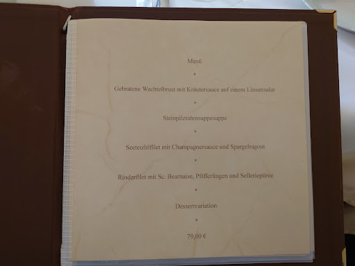 Read moreWer gerne französisch isst, wird sich hier zu Hause fühlen. Der "Patron" berät hier bei der Bestellung und erkundigt sich am Schluss persönlich nach der Zufriedenheit der Gäste. Dabei lassen Qualität, Zubereitung und Anrichtung keine Wünsche offen. Auch der Service hat unseren Abend sehr freundlich und aufmerksam begleitet. Ein kleiner Kritikpunkt betrifft die sehr leckere Steinpilzsuppe im Menü, die bei 28° C Außentemperatur überdenkenswert war. Alles in allem eine...