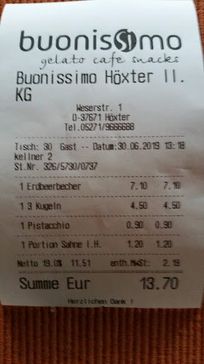 Wir waren heute das erste Mal da (obwohl ja schon viele die Preise dort bemängelt haben). Nun habe ich heute lediglich ein gemischtes Eis mit 3 Kugeln und Sahne bestellt, also eigentlich nicht die Welt und Standard. Tja, leider nur bis die Rechnung kam ! Was soll ich sagen, kostete für mich alleine EUR 6,60 !!! Wie bitte habe ich gefragt ? Wie kommt nun der Preis zustande ? OK 3 Kugeln * 1,50 (m.E. schon sehr grenzwertiger Preis für normale Kugelgröße), aber dann – eine normale Portion Sahne für EUR 1,20 !!! Und dann der Turbo-Aufschlag für das so gelobte Pistazieneis mit EUR 0,90 zusätzlich zu den EUR 1,50, bedeutet also EUR 2,40 für eine normal große Eiskugel !!! Ne, sorry, also irgendwann ist mal Schluß. Wir sind hier nicht in Berlin oder Hamburg und das Eis schmeckt normal. Auch der Erdbeerbecher meiner Frau mit EUR 7,10 und dann nur mit sehr wenigen Erdbeerscheiben dabei. Nein, das geht besser und das haben wir in Eisdielen schon ganz anders erlebt. Also hier definitiv –...