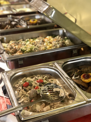 Es gab zum Mittag nach einer leckeren, am Tisch servierten festlichen Vorsuppe ein ebenso leckeres wie auch vielfältig zusammengestelltes warmes Buffet mit Rouladen, Hirschbraten, kleinen Lendchen in Rahmchampignons, Lachs und mit allerlei Beilagen (Thüringer Klößen, Kartoffeln, Kroketten, Bandnudeln, Rotkohl, Rahmgemüse, diversen Rohkost-Salaten etc) und als Nachtisch Mascarpone-Creme mit zweierlei Fruchtsauce in Minigläschen (die optimale Portionsgröße als süßer Abschluss des Festmahls). Das Buffett war wirklich sehr reichlich und wurde zudem bis zum Schluss stets nachgefüllt, so dass man sich nach Herzenslust bedienen und „durchkosten“ konnte - ein wirklich sehr aufmerksamer Service!