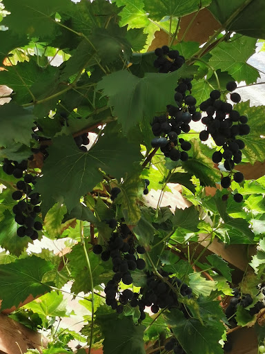 Drei Tische mit jeweils 2 stabilen Bänken sind in einer "Einfahrt" aufgestellt. Darüber rankt sich wunderschön der Wein mit seinen blauen Trauben.