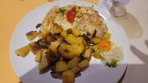 Bei meinem Hauptgericht war das Fleisch und die Soße sehr lecker. Jedoch war der Rotkohl leider nicht selbstgemacht (Vermutung). Des Weiteren gab es dazu Bratkartoffeln. Also ich bestelle immer in den Restaurants Bratkartoffeln und ich kenne es eigentlich nur mit Speck und Zwiebeln gebraten. Dies war dort augenscheinlich nicht so und jenes hat man geschmeckt. Es waren zwar zwei kleine Speckwürfel dazwischen, aber die reichen bei weitem nicht, um den Geschmack zu geben.