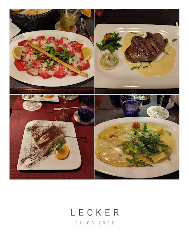 Das Ambiente und die Speisekarte ließen uns auf eine hervorragende italienische Küche hoffen. Die Ernüchterung kam leider sehr schnell. Der zum Brot gereichte Dip hätte eher in einen Burgerladen oder einen Grill gepasst: Ketchup mit Frühlingszwiebeln. Der penetrant süße Geschmack hat dem Brot nur geschadet. Die Vorspeise (Carpaccio vom Rind) war ganz ok, wenn man von dem zu dick gehobelten Parmesan einmal absieht. Dann das Hauptgericht. Die Grillplatte bestand aus einem Stück Bratwurst, die aufgeschnitten und von beiden Seiten gegrillt worden war, einem zähen Schnitzel, einem Stück Schweinebauch mit Knorpel und das vierte Stück war undefinierbar und zäh. Salat oder Gemüse gab es nicht dazu. Das andere Hauptgericht (Kalbsschnitzel in Weißweinsoße) war ebenso enttäuschend. Das Kalbsschnitzel war zäh, enthielt Sehnen und ließ sich kaum schneiden. Die Soße hatte nicht einmal einen Hauch von Weißwein, schmeckte nach einer Fertigsoße aus der Tüte. Zusammen mit jeweils einem Getränk durften wir für diese kulinarische Katastrophe 78€ bezahlen. Fazit des Abends: pure...