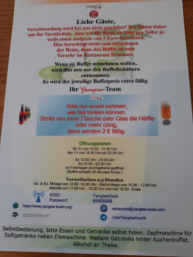 Read moreHeute 24.01.24 Besuch im Yangste-Restaurant in Hürth, nun der Parkplatz war etwas problematisch, weil das kleine Einkaufszentrum recht gut besucht war. Ein wenig Glück war von Nöten um doch noch in unmittelbarer Nähe fündig zu werden. (Gehbehinderung) Gegenüber anderer Besuche in dieser Lokalität nahm man keine Notitz von uns. Schade, früher wurden wir schon mal begrüßt, aber wir sind älter geworden. Hätte ja sein können, wir haben uns verlaufen. Wir haben für uns selbst Platz gefunden, war noch genügend frei. Wir Zwei, haben erstmal ein Buffetessen bestellt,was große Verwirrung hervor gerufen hat. War für die Gastgeber nicht zu verstehen, dass ältere Menschen nicht immer das Üppige Angebot möchten.Trotz der kleiner Verwunderung habe ich dann doch noch zugestimmt, am Buffetessen teilzunehmen. Schaffte damit sogar ein Lächeln in das Gesicht der liebenswürdigen Dame zu zaubern.War zu deuten wie,na geht doch. Weil mein Wunsch kleiner war,als das wirklich Große liebevoll,sehr opulent angrichtete Buffet, habe ich nach einer für mich kleinen speziellen Speise gefragt und wo sie platziert sei. Mit dieser Frage habe ich eine Revolution ausgelöst. Die Bedienung wusste es nicht und holte einen Kollegen,der es aber auch nicht finden konnte, (bei so viel Angebot nicht einfach) musste die Buffetaufsicht kommen, glücklicherweise fand ich genau jetzt, mein gesuchtes Gericht. Der Aufruhr konnte gerade noch aufgelöst werden, glück gehabt.