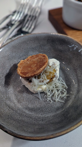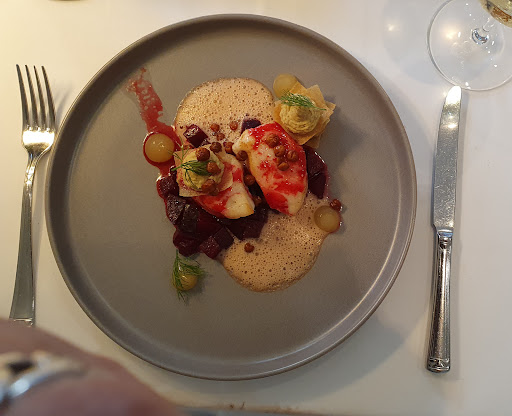 Das Essen.... Hochgelobt in vielen Rezensionen. Bei 100 Euro für das große Menü erwarten wir durchaus tolle Gerichte. Uns hat es nur in Teilen gefallen. Das hefige Brot geht einfacher kaum. Die Blumenkohl Suppe, ohne raffinierte Einlage, schmeckte wie eine klassische Champignon Rahmsuppe aus dem Sauerland. Das Rauchlachs Crepe hätte auch auf einem 500er Buffet liegen können. Die Garnelen waren qualitativ Ok aber auch nur Tapas Level. Ob da Pomelo rein passt, wir waren nicht sicher. Schwarzer Reis sehr ordentlich. Hätte ich mir mit Krustentier (man hat ja Garnelen Schalen) Aroma, vielleicht etwas Vanille oder Safran Aroma gewünscht. Dazu paßt schwarzer Reis hervorragend. Das Kalbsfilet qualitativ gut. Aber wenig raffiniert in simpler Sauce mit zusammen gewürfelten Schmor Anteilen und einfachem Kartoffelberei. Unmengen Schwarzwurzel. Wir fanden, so reicht das auf Gourmet Niveau einfach nicht.