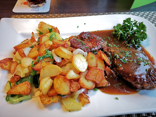 Hier sehe ich zwei Punkte: Das Essen Qualitativ gut, die Portionsgrößen ok, der Preis in meinen Augen zu hoch. Ein paniertes Schweineschnitzel mit gebratenen Zwiebeln, einem Spiegelei und Pommes mit Beilagensalat ist selbst in der heutigen Zeit mit 20,90 Euro zu hoch bemessen. Die Auswahl ist stark begrenzt, sehr wenig Vorspeisen (eine Suppe), sehr wenig Nachspeisen und die Hauptgerichte rustikal, wenig kreativ und wenig abwechslungsreich (Schnitzel, Steak, Schweinelendchen, Pfannkuchen, Salat und 2-3 weitere Gerichte).