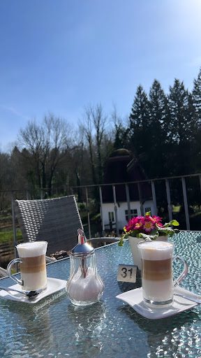 Der Service war ok, die Dame bemüht, aber freundlich. Der Gastraum in die Jahre gekommen, wir saßen im vorderen Teil. Der Servicebereich offen, die offenen Seiten der Regale (beinhalteten sämtlichen Servicebedarf) zu den Gästen hin gerichtet und einsehbar. Wirkte auf mich alles irgendwie, auch wenn es sicherlich nicht so war, zusammengewürfelt und nicht sonderlich einladend. Alles andere wirkte recht gewöhnlich und eher rustikal. Für mich auf jeden Fall kein Grund zu sagen: Hier gehe ich hin, weil es innen so schön ist. Im Außenbereich fiel direkt die defekte Mühle im Garten auf, mit dem abgebrochenen Flügel. Auch schade.