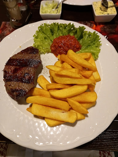 Schön zentral am Anfang einer Einkaufsstraße in Hachenburg gelegen lädt das Restaurant zu Steaks frisch vom Hokzkohlegrill. Der Empfang war freundlich und aufgrund der frühen Uhrzeit bekamen wir auch ohne Reservierung ohne Probleme einen Tisch. Das Ambiente ist schön und vermittelt ein wenig den klassichen Touch einen Steakhaus es. Restaurant und auch die sanitären Anlagen sind sauber. Die Speisekarte beinhaltet eine große Auswahl an verschiedenen Steakgerichten und auch Salaten. Es gibt auch die Möglichkeit verschiedene Menüs zu bestellen. Diese beinhalten 3 Gänge und man kann zwischen zwei Suppen als Vorspeise, einem Steakgericht mit Beilage und Salat und einem Nachtisch wählen. Vorab wird Brot und Dip gereicht welcher geschmacklich überzeugt. Das Brot sollte man nochmal überdenken da dieses leider aufgewärmt und sehr zäh war. Sowohl die Gulaschsuppe als auch die Gemüssuppe des Menüs überzeugen geschmacklich. Bei den Hauptgerichte sind vor allem die Bratkartoffeln geschmacklich gut. Man möchte nichts unterstellen aber das Steak schien von Grill aber meiner Meinung nach niemals vom Hokzkohlegrill. Die Qualität war in Ordnung. Der Beilagensalat oben auf mit frischen Salat darunter leider die Fertigpackung. Kann in Ordnung sein, unser Fall ist es leider nicht. Der Nachtisch, hier besteht die Wahl zwischen Tiramisu und Tartuffo war lecker. Parkplätze gibt es im nahen Umkreis und der Eingang ist nicht barrierefrei. Abschließend würde ich sagen, kämen nochmal wenn in der Nähe aber würde nicht extra zum Essen dafür nach...