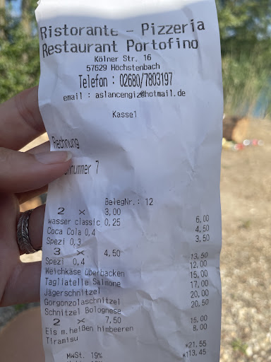 Read moreWir waren zu dritt an einem Freitagabend im Portofino. Die Lokalität liegt direkt an der Hauptstraße in Höchstenbach. Ist also relativ einfach zu finden. Parkplätze befinden sich direkt vor dem Haus , sind aber begrenzt. Ob es noch weitere Parkmöglichkeiten gibt, ist mir nicht bekannt. Das Ambiente in den Gästeräumen ist gut , der Wirt scheint seine Stammgäste beim Namen zu kennen. Bis zur ersten Getränkelieferung hat es etwas gedauert ... danach lief es aber. Die Speisekarte ist übersichtlich , lässt aber so gut wie keine Wünsche offen. Wir haben uns eine Vorspeise und einen Hauptgang gegönnt. Das Essen war durchweg lecker und hat allen Parteien geschmeckt. Mir persönlich hätte die Vorspeise (Bruschetta) etwas mehr Pepp vertragen können. Die Garnelen mit Spaghetti sind sehr zu empfehlen. Was auf jeden Fall zu einem Stern Abzug führt, sind die rudimentär gestalteten Toilettenanlagen. Hier müsste dringend modernisiert werden ... dann gibt es...