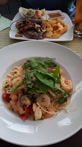Read moreWir sind zufällig in der Oase gelandet, weil ein anderes Restaurant geschlossen war (übrigens lt. Internet geöffnet). Allerdings sind wir unglaublich froh über diesen Zufall. Die Speisekarte ist für ein Campingplatz Restaurant außergewöhnlich! Wir hatten das Roastbeef Steak und Garnelen mit Spaghetti und zum Nachtisch Quark Pancake mit Blaubeeren und Amarenaeis. Wir haben lange nicht mehr so gut gegessen. ALLE Zutaten waren frisch, unfassbar lecker zubereitet, saftig, würzig, cremig (das Eis), fluffig (Pancake), wirklich absolut klasse. Und anständige Portionen, wir sind richtig satt geworden! Der junge Mann, der uns bedient hat, war echt auf Zack und ist nur von Tisch zu Tisch geflitzt! Und ich nehme an, genau weiß ich es nicht, die Frau, die dort rum wuselte, war evtl die Köchin... Wir haben uns super wohl gefühlt und wenn wir nicht nur auf der Durchreise wären, würden wir morgen wieder dort essen. Und vielleicht an einem Tisch am Weserstrand den Sonnenuntergang genießen. Deshalb in allen Kategorien...
