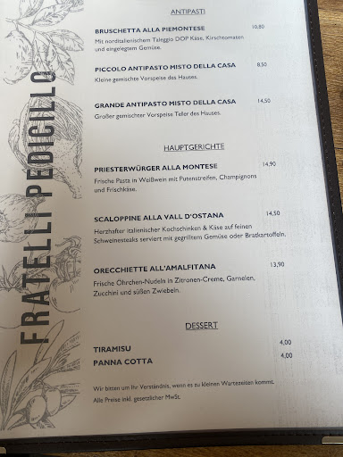 Read moreGestern Mittag haben mein Mann und ich bei Fratelli Pedicillo in Hagen gegessen. Der Feinkostverkauf mit Restaurant ist uns erst kürzlich aufgefallen, da das Ladenlokal an der Bechelte 30 a, in Hagen, verdeckt hinter dem Geschäft "Fressnapf" liegt. Die Speisetische sind im Feinkostgeschäft angeordnet, es gibt zudem einen etwas abgetrennten Raum und im Sommer eine Außengastronomie. Begrüßt wurden wir von einem freundlichen jungen Mann, der uns zu unserem Tisch brachte. Als Gruß aus der Küche erhielten wir Brot, Frischkäse und fruchtiges Olivenöl serviert. Wir bestellten Priesterwürger alla Montese und Scaloppine alla Vall D'Ostana mit Bratkartoffeln. Wir wurden freudig überrascht, beide Speisen schmeckten frisch, lecker und schön aromatisch. Zudem empfanden wir die Portionen als reichlich und preisgünstig. Der freundliche junge Mann, der uns bedient hatte, fragte weiterhin nach unseren Wünschen, jedoch waren wir nach dem reichlichen Portionen beide sehr satt und zufrieden. Zudem bietet sich das Feinkostgeschäft mit tollen Waren an, es wird auch Catering und Außer-Haus-Verkauf angeboten. An der Frischetheke bereiteten während unseres Aufenthaltes 2 junge Damen Platten mit Wurst und Antipasti für das Catering vor, auch diese sahen sehr ansprechend aus. Das Ambiente im Ladenlokal hat und gut gefallen. Wir werden auf jeden Fall wieder...