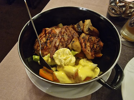 Wir waren vor ein paar Tagen dort 4 Erwachsene 1 jungelicher u.1 klein Kind ,haben ne Woche vorher Reserviert. Wir sind Nett empfangen worden. Nach einiger kurzen Zeit kamen die Speisekarten u.es wurden schon Getränke aufgenommen. Hatte mir ein Tag vorher schon im Internet ausgesucht was ich essen wollte naja ich hab nochmal ins die Karte geschaut und siehe da das Geeicht stand gar nicht auf der Karte (da war ich schon leicht angesäuert) die Karte im Internet stimmte garnicht mit der Karte im Gasthaus überein Ich hab mich dan für den Lachs entschieden. 2mal Schnitzel mit spiegelei und Bratkartoffeln, 1 mal das gefüllte Steak,1 Steak mit Zwiebeln u.1 Biene Maja In der Zwischenzeit wie wir warteten habe ich mich gefragt warum um halb 7 kein Tisch reservierbar sondern um 18 Uhr auf dem weg zum Salat Buffet sah ich das da noch ein Saal war dee gut gefüllt war die Gäste waren fast fertig mit Essen u.die Servicekräfte waren am abräumen naja da wo wir sassen waren noch 3 Tische frei u.eine andere Familie kam um halb 7 alles komisch das aber was solls Das Essen kam es sah gut aus der Geschmack vom Lachs war lecker der Brokkoli hat das heiße Wasser nur kurz berührt. Ich habe dan nur die Köpfe gegessen der Lachs war nach einem 1/4stück nicht mehr genießbar für mich ja Greten kann passieren aber ich habe nochnie soviel greten in einem Stück Lachs gehabt da hatte ich den Kaffee ganz auf u.hatte kein Hunger mehr Die Bratkartoffeln waren sehr fertig die Schnitzel naja Der Salat aus der Salatbar habe ich komplett aufgegessen das Dressing war auch lecker Wir wissen nicht ob wir es nochmal versuchen sollen wir sind am überlegen. Der Service war gut hat das getan was ein Service zutun hat Aktualisiert die...