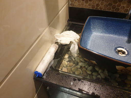 Zum Ambiente: Der Innenbereich ist schön gestaltet, allerdings nichts besonderes. Es handelt sich um einen großen Raum, der die Lautstärke kaum auffängt. (-/+) Während man am Tisch sitzt, wird man von den vergleichsweise lauten Gesprächen des Personals untereinander beschallt. Ich weiß nicht, ob die Dame vorhin telefonierte oder ein Funkgerät in der Hand hatte, jedoch war es viel zu laut. (-) Zwischendurch wird man von der Musik des Roboters unterhalten, der an einem vorbeifährt. Bei der Musikauswahl hat man anscheinend mit 3 Liedern etwas gespart. (-/+) Als ich mir, durch klebrige Teller, die Hände auf dem WC waschen wollte, kam mir erst einmal eine benutzte Farbrolle am linken Waschbecken unters Augenlicht, aus diesem Grund nahm ich das rechte Waschbecken. Leider kam hier kaum Wasser raus. Als ich mich umdrehte, um mir die Hände abzutrocknen, wurde ich dann von einem vollen Mülleimer begrüßt. Dann nahm ich doch lieber das automatische Gerät.