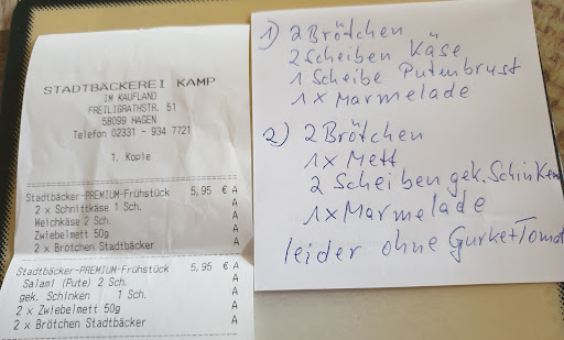 Waren heute bei Kamp im Kaufland Freiligrathstr. Kaffee trinken. Hatte ein Premium Frühstück. Es waren 2 Brötchen, 1Scheibe Putenbrust, 2 Scheiben Käse durchgeschnitten, 1 Marmelade und 1Butter. Und der Preis war 5,95 Euro. Kaffee kostete extra. So ein teures Frühstück nie wieder. Früher gab es noch ein Ei dazu. Für die Marmelade habe ich 1.40 Euro laut Bedienung bezahlt. Eine Frechheit. Nie wieder Kamp!!! Habe Foto gemacht und Kassenbon eingesteckt, wo ganz andere Beläge aufgeführt sind. Marmelade ging wohl nicht. Dafür wurde Mette eingetippt. Mein Mann hatte 2 Brötchen, 1x Mett, 2 Scheiben gekochten Schinken und...