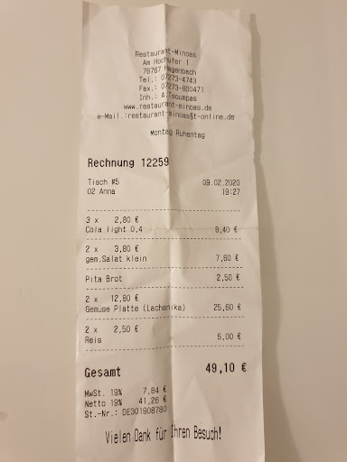 Wir waren heute Abend mit 11 Personen im Lokal. Die Bedienung versuchte ihr möglichstes uns gut zu bedienen. Mein Mann und ich hatten 3 x Cola light, 2 x kleinen gemischten Salat, Pita Brot, 2 x Reis und 2 x die Gemüseplatte. Wir hatten bei der Bestellung ausdrücklich darauf hingewiesen, dass der Salat mit Essig und Öl kommt und die Gemüseplatte komplett ohne Käse. Die Getränke kamen, alles okay. Das Pitabrot war sehr fettig, das entgegen der Ankündigung aufgrund einer Nachfrage und der anschließend gelieferte kleine gemischte Salat kam als REINES Grünfutter in Öltränke daher. Keine weitere Art von Salat. Wenn ich dann dazu die "normalen" Beilagensalate zu den Hauptgerichten der anderen Gäste angesehen habe, fühlte ich mich gelinde gesagt verarscht. Es kam weder aus der Küche oder vom Service der Hinweis das wenn man EssigÖl mag man abgespeckte Version zum gleichen Preis bekommt..... Das waren die ersten zwei Sterne weniger...... Dann kamen die Hauptgänge. Ich muss sagen optisch gesehen große Portionen..... aber wenig Tzatziki.... Dann kam 2x Gemüseplatte Lachanika. Laut Karte Gemüseplatte mit Schafskäse, gegrilltem Champignon, grüne Bohnen, Sommergemüse und dicken griechischen Bohnen. Wohlgemerkt das ganze war ohne Schafskäse bestellt, da wir beide uns vegan ernähren. Es kam eine Platte mit Blumenkohl und Brokkoli, die in Packungshollandaise ertränkt waren, auf der anderen Seite eine gegarte Tomate ebenfalls mit dieser Sauce..... in der Mitte etwas Undefinierbares an Artikeln mit einer Tomatensoße mit weißen Stückchen. Wir haben beide die Servicekraft angeschaut und gefragt was das sei... Vor allem das mit voller Absicht ohne Käse und dergleichen bestellt worden sei. Somit ging das ganze zurück zum nochmal neu ohne Käse und Käsesauce zu machen...... Dann kam die Beilagenportion Reis. Trister Reis mit Suppengemüse ohne große Würze oder Tomatensoße und so.... vor allem keine 5 Gabeln... Dann kam die Korrektur der Gemüseplatte. Zum einen mit paniertem Schafskäse und den weißen Flocken in der Tomatensoße. Auf Nachfrage wurde beteuert es wäre kein Käse, die anderen sagten es sei Käse..... NA TOLL. Somit wieder 2 Sterne weniger. Blumenkohl und Brokkoli waren geschmacklos, ebenfalls die matschelige Tomate mit Reis gefüllt(sollte mal nen Grill sehen). Die grünen Bohnen waren jenseits der Garzeit.... und natürlich in einer Tomatensoße mit Käse ertränkt, die nach nichts geschmeckt hat. So war es auch mit Paprika dicken Bohnen und dem gegrillten Champignon. Ich frage mich immer noch was da wirklich 12,90 € Wert ist..... Auch dass die Wünsche der Kundschaft es nicht vom Service in die Küche geschafft haben..... Okay ich kann verstehen was sucht der Veganer beim Griechen, es ist nun mal ne Familienfeier.... Weiter wäre es schön wenn der Service sich bei nur 11 Gästen im Lokal auch die nehmen würde nach Getränke nachzufragen. Das kann man erwarten. Dafür dann 49,10 € zu zahlen ist nicht gelungen. Ich würde bei Sommergemüse was anderes erwarten. Vor allem nicht nur Käse Käse Käse. Vielleicht sollte man dahingehend die Karte überdenken und mal auch die Saucen auf der Karte erwähnen. Weiter waren alle an dem Abend von den Leistungen der Küche nicht begeistert. Auch war mehreren übel.... Somit kein zweites...