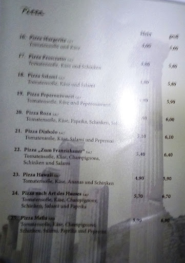 Read moreDas Personal, zumindest die junge, weibliche Bedienung ist sehr nett, aufmerksam, fleißig und schnell unterwegs. Das Ambiente in dem Lokal ist nett. Im Sommer kam man draußen im Biergarten sitzen. Es war alles sauber. Parkplätze sind vor dem Lokal an der Straße vorhanden. Auf der Speisekarte gibt eine gute Auswahl an griechischen und italienischen Gerichten. Die Preise sind wirklich sehr günstig. Meine Pizza Fantasia war nach knapp 20 Minuten da und sehr gut. Sie hatte einen leckeren Teig, war bis zum Rand gut belegt und es alles hat gut und frisch geschmeckt. Die Pizza war vom Umfang her zwar nicht so groß jedoch üppig und dick belegt und war schmackhaft und delikat. Nach dem Essen gab es einen Ouzu aufs Haus. 11,30 Euro für eine sehr gute Pizza und 2 Weizenbier ist wirklich sensationell günstig. Mein Besuch hier war insgesamt eine sehr gute Erfahrung. Meine Bilder geben leider nur einen kleinen Ausschnitt der Speisekarte wieder, da einige der Bilder leider...
