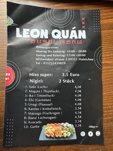 SEHR EMPFEHLENSWERT! Ich bestellte für meine Geburtstagsfeier für 24 Personen gebratenen Frühlingsrollen, Algensalat, gebratene Nudeln, knusprige Ente und gebackene Garnelen mit Reis und Sushi. Geliefert wurde in Chafing Dishes und Sushi-Platten. Soßen wurden in Plastikbehältern und Glasflaschen mitgeliefert. Es war sehr ansprechend angerichtet, wirklich reichlich, unheimlich lecker und richig frisch - die Qualität entspricht einem guten Restaurant. Meine Gäste waren begeistert und werden dort ebenfalls bestellen. Die Inhaber sind sehr freundlich, bereits bei Bestellaufgabe. Die letzen Fragen wurden kurz vor Lieferung per Handy geklärt. Bei Abholung gab es eine Flasche Sekt und einen Gutschein als Geburtsstagsgeschenk. Ich komme sehr gerne wieder und kann Leon Quán nur empfehlen, vor allem die Sushiplatte ist...