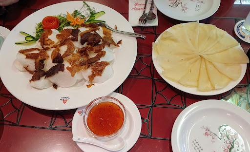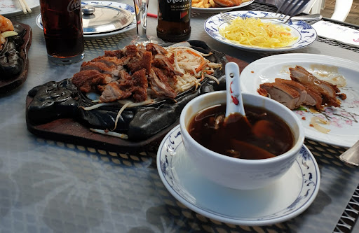 Read moreWir hätten nicht gedacht, dass es in Halberstadt mitten in der Woche so schwer ist, ohne Reservierung einen Tisch für zwei Personen in einem Restaurant zu bekommen. Was ja schon mal für sich spricht. Dadurch sind wir (notgedrungen) hier gelandet. Der Empfang war sehr nett, Karte und Getränke kamen flott. Es gab Buffet. Soweit man dies in einem chinesischen Restaurant Buffet nennen kann. So wenig Auswahl haben wir noch nie gesehen. Ente und Schweinefleisch dermaßen trocken, dass man das Fleisch gar nicht mehr erkennen konnte. Hühnchen zu ergattern, war Glücksache. Nachtisch (Eis) war sehr schwierig, ein Kügelchen ins Schälchen zu bekommen. Evtl. mal die Temperatur etwas runter schrauben, dann klappt das auch. Es war 19.30 Uhr und es war nicht möglich, sich noch einmal Nachschlag zu holen, da nichts mehr aufgefüllt wurde. Der traurige Rest des Buffet's wurde nur gelegentlich mit den Händen ungerührt, damit es warm bleibt. Natürlich ohne Handschuhe. Lieber unterhält sich das Personal (oder Chef?) mit evtl. Stammgästen über Putin und die aktuelle politische Situation und dass ohne den erstgenannten nichts geht. Getränke waren gut, beim geschenktem Pflaumenschnaps vielleicht mal die Hälfte anbieten, dann aber auch nicht so doll mit Wasser gestreckt. Wir werden wohl nicht mehr wieder kommen und wissen jetzt auch, warum wohl dieses Restaurant das einzige war, was erstaunlicherweise noch...