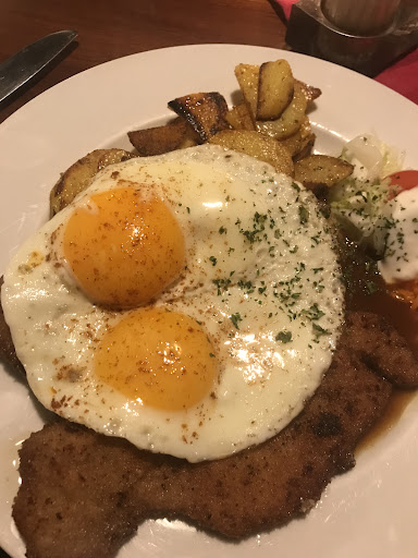 Das Schnitzel: Das Schnitzel war eine Spur zu lange in Pfanne. Die Panade ist dann nicht mehr knusprig, sondern hart. Außerdem fehlte Zitrone. Die verleiht dem Schnitzel eine frische Note und sieht auf dem Teller gut aus.