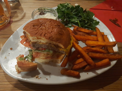 Irgendwann kam mein Hamburger mit Krautsalat und Süßkartoffelpommes. Die Pommes waren fast schwarz, der Krautsalat war ne Fertigmischung und der Burger war ebenfalls null gewürzt. Normalerweise hätte ich dann noch Ketchup oder eine Barbecuesauce erwartet, aber beides gab es nicht. Sicherlich hätte man das ordern können, aber wieder extra bezahlen müssen.