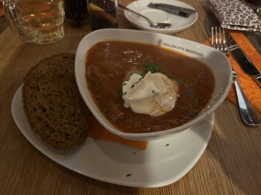 Read moreWir hatten uns zum Valentistag spontan für das Brauhaus entschieden und bekamen dort noch Platz. Die Bedienung war sehr freundlich und konnte uns die Fragen zu den verschiedenen Bieren gut beantworten. Als Vorspeise hatten wir den kleine Laib Brot mit verschiedenen Dips. Das war sehr lecker. Dann wurde der Hauptgang serviert. Meine Frau hatte die Brauhauspfanne mit Bratkartoffeln, Sauerkraut, einem Kammsteak, einem Kasslersteak und einem sogenannten Bierbratling. Der Teller war nicht sehr groß, so dass der Preis von 16 € schön etwas fragwürdig war. Auch das Fleisch war sehr fragwürdig: das Nackensteak hatte eine Größe von ca. 6x3 cm und bestand quasi nur aus Knorpel, das Kasslersteak war etwas größer, dafür jedoch nur ca. 3mm dick und der Bratling schmeckte wie ein Fertigveggieburger. Das Essen war schlecht gewürzt und meine Frau bat die Bedienung nach Pfeffer und Salz sowie etwas Senf. Alles wurde rasch gebracht, jedoch wurde der Senf tatsächlich mit 0,40 € extra berechnet! 😡
