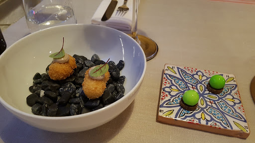 Kommen wir als erstes zum Ambiete. Das Restaurant ist sehr schön gelegen, auf einem Berg mit einer tollen Aussicht. Im Inneren zeigt sich ein moderne Einrichtung mit vielen schönen Details. Es gab eine interessante Musikauswahl, die allerdings teilweise sehr laut war. Das Resturant selbst besteht aus zwei Säalen, einem der für das Mittagsgeschäft am Wochende genutzt wird und dem Hauptsaal für den Fine Dining Bereich. Es gab 3 große Tische, mit jeweils Platz für bis zu 6 Personen.
