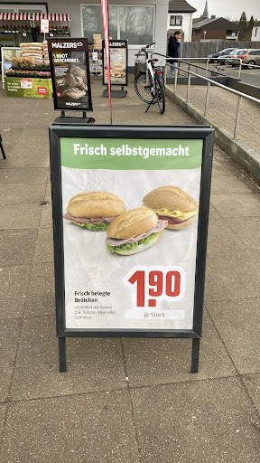 Draußen steht Werbung (Foto) von Malzers, frisch belegte Brötchen 1,90€