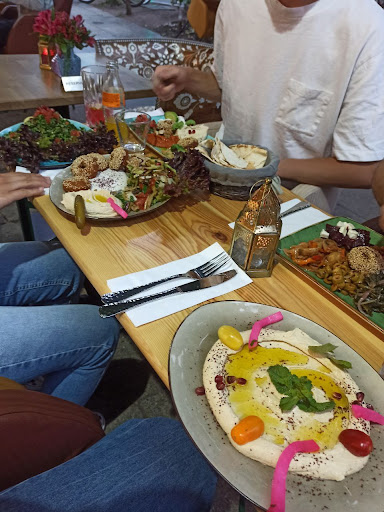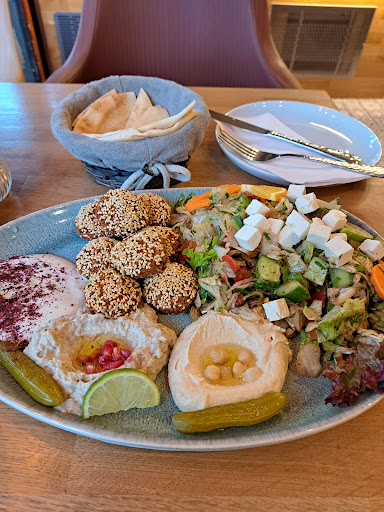 Read moreLeider haben wir uns auf die 5-Sterne Bewertung verlassen, wo wir uns aber fragen wie die Zustande kommt. Wir haben jeder eine Mazza Platte gegessen - auf den ersten Blick schön anzusehen. Dazu wurde Fladenbrot gereicht, auf dem leider Schimmel zu entdecken war. Den haben wir erst entdeckt nachdem wir schon davon gegessen hatten :/ Daraufhin hat die Bedienung freundlicherweise den Brotkorb ausgetauscht, doch leider war uns der Appetit dadurch verdorben. Die Pasten und Aufstriche waren für unseren Geschmack ziemlich übersäuert und überwürzt, dass wir am Ende garnicht mehr viel geschmeckt haben. Als wir es noch mit einem Nachtisch von verschiedenen Baklava versucht haben, wurden wir leider wieder enttäuscht, alt und trocken haben die geschmeckt. Die Falafel hingegen waren sehr gut und der Service freundlich...