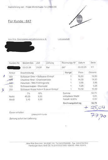 Read morevor 2 Jahren Bratnudeln mit gebackenem Hähnchen über Lieferando bestellt: Bekommen habe ich ölige Spaghetti, das Hähnchen schmeckte nach älterem fett. Ungenießbar. Hinzu kam, dass der Lieferant unglaublich unfreundlich war. Ruft mich an und sagt kommen sie ihr essen abholen ,da meinte ich sie meinen die Tür auf machen? Hat er einfach aufgelegt, frech! Dann versuche ich ihn anzurufen 2 mal geht er nicht ran, fragt man sich was hat er in der zeit mit meinem essen gemacht ? Ruft er mich zurück und meckert mich an das mein Name nicht an der klingel steht da meinte ich wo stehen sie denn, ja da und dann meinte ich sie müssen eine weiter meckert er mich wieder an ich habe was falsches angegeben, er kommt oben an was steht auf der rechnung alles richtig ... Kein Cent trinkgeld, letztes...