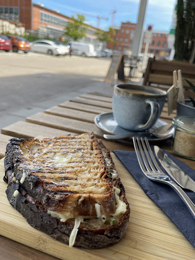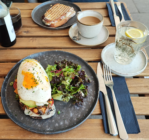 Wow!!! Das Konzept ist einfach klasse! Das Interieur hat einen leichten Industriecharme. Gepaart mit dem Holz wirkt es clean aber auch sehr gemütlich. Die Kombination ist wirklich sehr gut gelungen. Unser Essen war super! Wir hatten den "Strammen Max" (vegetarisch - siehe Foto). Serviert auf einem geröstetem Brot, mit hausgemachtem Humus (leichte Schärfe) gebratenen Pilzen, Avocado und Spiegelei. Dazu ein kleiner dezent angemachter Salat. Ein Gedicht. So einfach und so gut! Das "Grilled Cheese Sandwich" war auch sehr lecker! Ein Muss für jeden Käseliebhaber. Die Karte bietet eine tolle Auswahl. Würde ich auf der Ecke arbeiten, wäre ich ständig hier. Am Wochenende sollte man sich die Speisekarte vorher anschauen, denn diese unterscheidet sich zu den Wochentagen. Den Kuchen hatte ich zwar nicht probiert, dennoch sah er in der Auslage verführerisch aus. Beim nächsten Mal. Die Preise sind völlig in Ordnung. Die beiden Mädels waren auch total nett. Hilfsbereit, freundlich und immer ein Lächeln auf den Lippen.