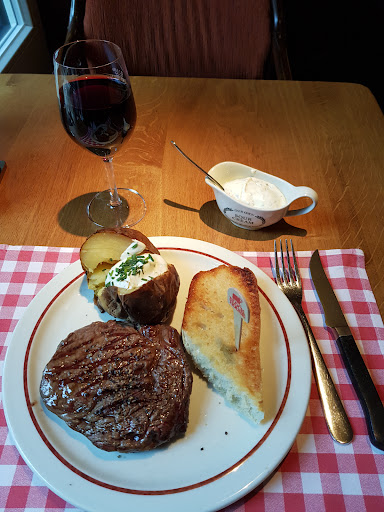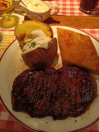 Located in great location on a public square, Block house has indoor and outdoor seating. The service was excellent and ambiance is a little dark with an odd color scheme. The salad was excellent and was crisp, fresh and very tasty. The steak was ok but was cooked just as ordered and presented nicely.( I'm from Alberta Canada and eat some of the best beef in the world). The garlic toast was ok but not enough garlic for my tastes but cooked perfectly. The potato was outstanding and was served with Block House's own homemade sour cream. I ordered a merlot for wine and it was perfect with my meal. I ate here in early afternoon and did not see all the 60+ people mentioned in previous reviews. In fact most of the customers were 35 and younger in my opinion. Overall a very good meal but needs a few tweaks...