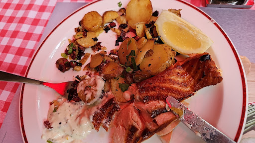 Read moreAbsolutely INCREDIBLE lunch menu (Monday through to Friday lunchtime, ask for Mittagstisch menu). Food was BRILLIANT and at an incredible cost - A fab and large mixed salad bowl plus a choice of mains (I chose salmon and took a photo After having eaten some of it), all for 12.30€. For a veg option ask the waitress, they will put it together for you at the time from their available options. My mum asked for the mains to be packed so she could take it home for her dinner - that's how ample the salad was. Service / waitress wonderful despite the huge demand. Highly recommended. Note that in German restaurants you are able to take your dogs (on leash). Cleanest WC facilities you'll ever find in any restaurant, anywhere. Update Nov 2024. Still coming here when visiting Hamburg. It is...