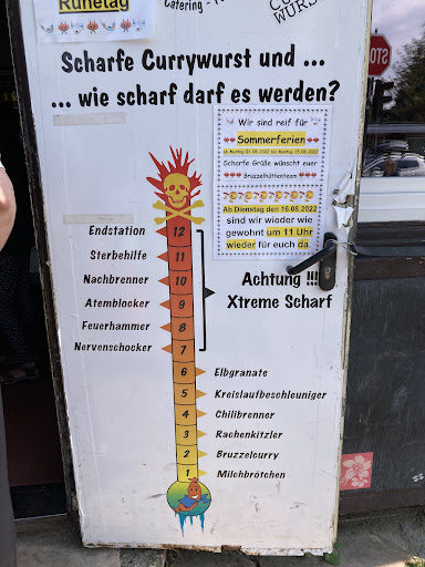 Came here today to try their spicy currywurst after my boyfriend heard about it on Australian TV. First he tried 5,7 and 10. The "barometer wurst" is a great option to slowly test your limits. You get to pick 3 different sauces. Then he tried the 11 and broke a bit of a sweat and a runny nose 😂 That level is definitely not for the faint-hearted. Level 11 can only be purchased after you successfully finished level 10. I think it's a smart way to get overly excited people to not get ahead of themselves! Level 12 is only available at competitions and with an ambulance at disposal, which I think is absolutely reasonable. We had great fun and the service was friendly and quick. Prices are moderate but the food was actually really good- even the vegetarian sausage! I picked level 4 and was a bit underwhelmed because it wasn't spicy in the slightest. I usually eat korean noodles that are really spicy and have the same scoville ranking but are BY FAR spicier than level 4 at Brutzelhütte. The fries were yummy as well and the serving sizes are reasonable. If you are nearby, make sure to stop by if you feel like...