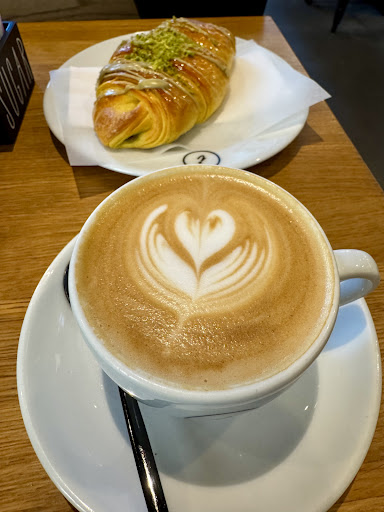 Friendly and polite staff Good quality coffee Freshly baked croissants and pastries Beautiful interior and nice atmosphere Indoor and outdoor sits Wheelchair accessible entrance Mostly good music selection Fair prices They speak both German and English Payment with both cash and card Good for working with laptop, reading, chilling, hangout, and maybe dating