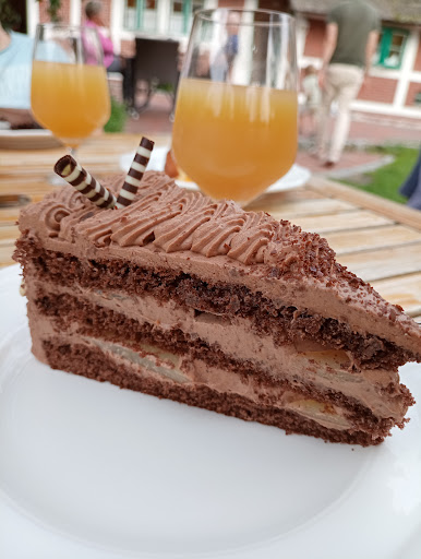 Read moreSehr uriges Café in einem wirklich tollen alten Haus. Die Verzierungen sind wirklich grandios. Die Einrichtung innen ist gemütlich und urig, wenn auch schon etwas in die Jahre gekommen. Es gibt mehrere Räume, in die man sich setzen kann. So kann auch für eine Gruppe reserviert werden und man sitzt privat. Im Café ist auch ein kleiner Hofladen mit selbstgemachter Marmelade, Schnäpsen und Likören, Apfelsaft aus eigenen Äpfeln und viel Dekoration für drinnen und draußen. Bestellt hatten wir eine heiße Schokolade, Latte Macchiato, ein Stück Stachelbeer-Baiser- und Mondscheintorte. Einzig vom mitgenommenen Stück Zwiebelkuchen war ich enttäuscht. Er hat wie vom...