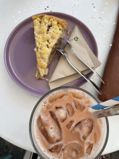 Ich konnte mir zusätzlich das letzte Stück Apfelkuchen sichern, das von hervorragender Qualität war. Nachdem ich bezahlt und großzügig Trinkgeld gegeben hatte, wurde mir versprochen, dass mein Kaffee und der Kuchen draußen serviert würden.