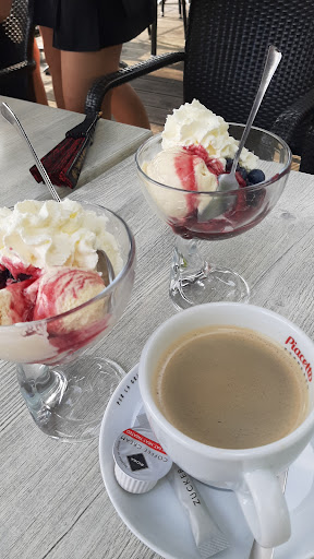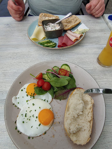 Getränke ja, Essen nein! Fisch wird mit Kartoffeln und Gurkensalat angeboten, welcher in sehr kleiner Menge mit auf den Teller drapiert wurde....leider dann auch mit wenig Geschmack, anscheinend noch nicht durchgezogen. Es war Montag, Essen ca. 18 uhr. Aber der Hammer kam zum Schluss: meine Freundin bestellte für ihre erwachsene Tochter mit Downsyndrom zum Dessert eine Kugel Erdbeereis. Diese wurde in einem Kaffeebecher serviert, Löffel schon in der Tasse, ohne Serviette. Das Mädel hat ihr Fischgericht vorher einwandfrei gegessen. Es gab keine Veranlassung, eine Kugel Eis in einer Henkeltasse zu servieren!!!!! Und eine Serviette gehört zu jedem Essen. Ich war gestern zum Geburtstagsessen eingeladen und mochte uns den Tag nicht verderben lassen, aber mal ganz ehrlich: wir waren alle vernünftig gekleidet, das Mädel hat 1a Tischmanieren - warum bekommt sie ihr Eis nicht in einer Dessertschale?... oder ist diese Art üblich für jeden Gast? In einem Cafe? Der Kellner war sehr nett und auch flink, er brachte auf Nachfrage auch alles, was standardmäßig dort fehlt: Salz, Pfeffer, Servietten. Und Behindertengerechter Zugang? Die sehr lange Treppe hat einen Handlauf, ja. Aber für Rollator- oder sogar Rollstuhlnutzer nutzt das ja wohl nichts, oder? Aber diese Leute bekämen dort womöglich ihr Essen dann auch püriert in einer...