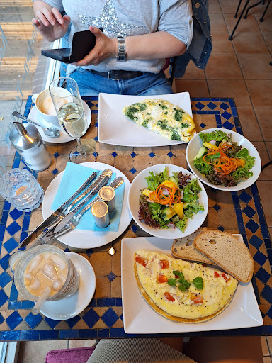 Wir waren mit 10 Personen in dem Café. Einige haben etwas gegessen, andere "nur" etwas getrunken. Alle angebotenen Speisen waren schlecht. 3 von uns haben jeweils eine Kanne grünen Tee bekommen. Diese Kannen waren halb gefüllt, so dass der Teefilter nur zum kleinen Teil im Wasser ziehen konnte. Der Großteil der Teeblätter lag also im Trockenen bzw. war bei Ende dee "Ziehzeit" noch immer trocken. Auf Nachfrage bei der völlig überforderten und aus unserer Sicht genervten Chefin, erhielten wir den Hinweis, dass es ein halber Liter sei. Den Sinn habe ich nicht verstanden. Wenn es, was völlig in Ordnung wäre, einen halben Liter Wasser für den Tee gibt, dann sollte man halbe Liter Kannen nehmen, so dass der Tee auch im Wasser ziehen kann oder man nimmt eben einen Becher oder eine Tasse. Aber Tee sollte nun mal im Wasser ziehen und nicht an der Luft. Einer von uns bekam dann, weil es so nett sein sollte, etwas Wasser zusätzlich reingegossen. Da hatte der Tee aber schon gezogen...Nach ca. 20 Minuten kam die Bedienung zu uns an den Tisch und sagte zu "2 Teetrinkern", dass wir noch etwas bestellen sollten, da wir ja nichts gegessen hätten. Das ist schon sehr merkwürdig und aus meiner Sicht geht so etwas nicht. Wir sitzen in einem Café und müssen dann, obwohl noch andere beim Essen sind und wir unseren Tee noch nicht alle ausgetrunken hatten, Tee o.ä. nachbestellen, da wir ja nichts zu Essen bestellt hatten. Die Chefin, ich glaube es war die Chefin, war aus meiner Sicht nur "vordergründig" höflich und tatsächlich aber sehr unfreundlich. Sie wirkte zusätzlich sehr genervt. Die junge Bedienung war sehr nett und echt freundlich, ihr wurde aber ständig von ihrer Chefin ins "Handwerk" gepfuscht. Die Speisen, also Flammkuchen, Kartoffeln,...waren schlecht bis "naja, kann man essen". Der Laden selbst ist ganz nett aufgemacht. Wir gehen dort nicht wieder hin. Dies ist die Kurzform unseres Besuchs. Die diversen weiteren Sprüche der Chefin z.B. bzgl. des Aufstellens eines Hochstuhls für unsere Enkelin, über die Tatsache, dass wir nicht wie reserviert, sondern unverschämterweise 3 minuten vorher da waren usw., lasse ich mal außen vor. Trotzdem war es für uns in dem Café ein schönes Beisammensein, denn wir haben uns die gute Laune von der Art und Weise der Chefin nicht verderben lassen. Vielleicht habt ihr ja mehr Glück...bei der Chefin glaube ich es allerdings nicht, denn es scheint einfach ihre...