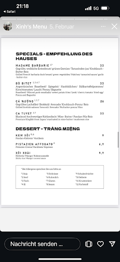 Read more30.1.25/20:00 Neues vietnamesisches Restaurant in Winterhude. Ein paar Stufen nach unten geht's ins Ecklokal. Die Einrichtung ist typisch vietnamesisch kunterbunt zusammengestellt. Auffällig ist die goldene Decke. Die freundliche Bedienung hat unsere Bestellung schnell aufgenommen: Das Beef Tataki / Roastbeef (€12) ist schön rosa und kommt lauwarm in leckerem Bratensud daher. Das Sake Tiradito / Lachs Sashimi (€12) ist frisch, zart und zergeht auf der Zunge. Das Rau Xao / Grünes Gemüse (€7) ist schön knackig in leckerer Soße. Das Xoai Lac / Mangostückchen mit Salz und Erdnüssen (€6) fanden wir ein bisschen zu hart. Die Pho Ga (€16,9) ist klassisch. Dazu frische Limone und kleingehakte Chilies sowie eingelegte Knoblauch mit Chilies zum selber abschmecken. Insgesamt eine schöne Neuerung in dem an asiatischen Restaurants nicht...